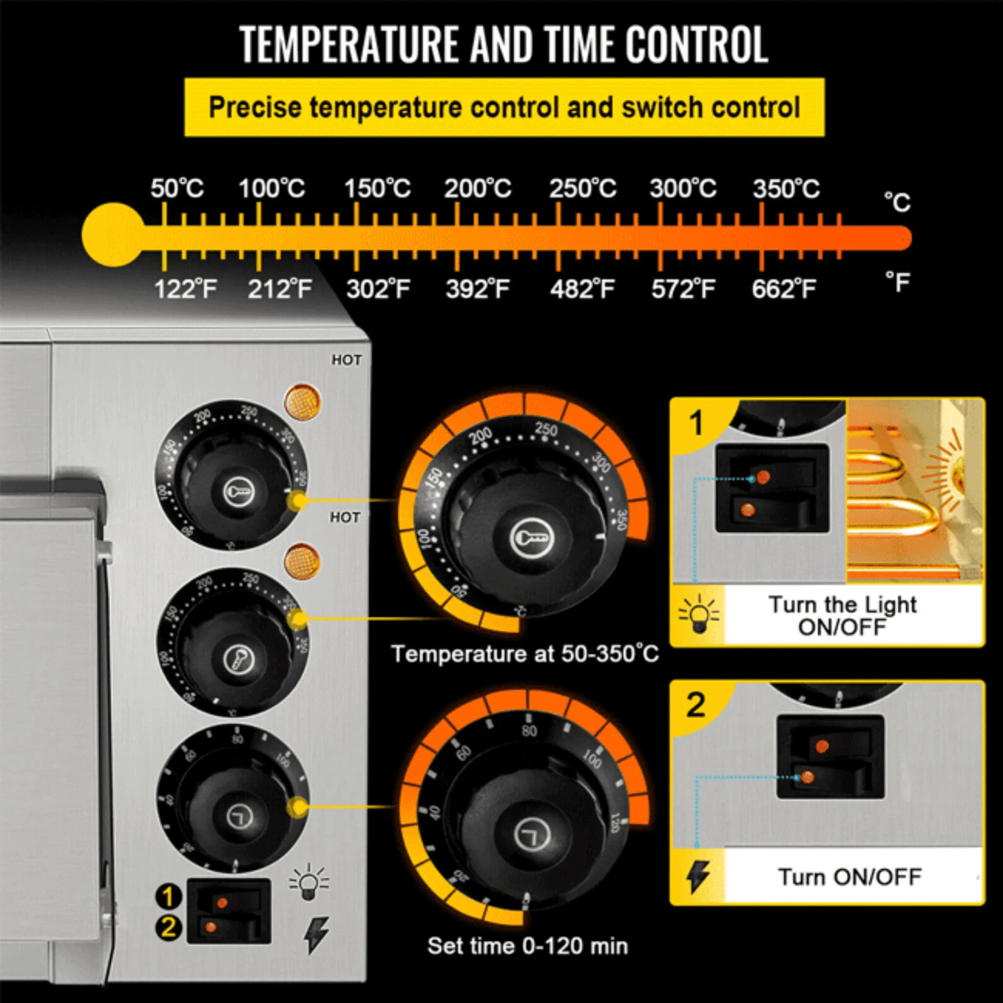 The controls on this pizza cooker oven is extremely easy to use with the knobs and buttons at the front allowing you to adjust the timer, temperature and light settings of the oven. This way, you won't need to worry about your food overcooking and be able to enjoy a delicious pizza in minutes.